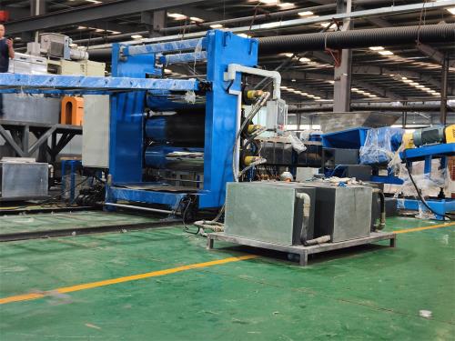 3)螺紋元件材質(zhì)為優(yōu)質(zhì)高速工具鋼6542,高溫真空淬火熱處理;整體硬度:HRC60-64;螺桿元件通過加工中心制作,由曲面成型磨加工;5、料筒1)材質(zhì):45#鋼為基體,∞內(nèi)孔采用優(yōu)質(zhì)雙合金襯套;共十二節(jié),L=290mm/節(jié),第一節(jié)筒體為進(jìn)料筒體,第六為自然排氣;第十節(jié)筒體為抽真空;其余筒體為閉口筒體,筒體采用軟水冷卻;2)加熱區(qū)段:進(jìn)料區(qū)不加熱,其他采用優(yōu)質(zhì)鑄鋁加熱器。6、水冷卻系統(tǒng)1)水泵泵電機(jī)功率:3kw;自動控水電磁閥;手動閥用銅閘閥控制;加大水流量,2)采用環(huán)保風(fēng)冷卻系統(tǒng)(環(huán)保型:發(fā)明專利號:CN201911312134.6)不需要接外循環(huán)水冷卻,不用徘外水;采用閉環(huán)循環(huán)系統(tǒng)7水循環(huán)真空泵,功率:2.2KW,真空泵采用環(huán)保冷卻系統(tǒng)(環(huán)保型:發(fā)明專利號:CN201911312115.3)不需要接外循環(huán)水冷卻,不用徘外水;8、液壓板式換網(wǎng):1)換網(wǎng)器,板式過濾自動換網(wǎng)器,流量截面為圓形;2)液壓缸、液壓站等一套,采用YA-N46抗磨46#液壓油;(油品需客戶自行采購)TPE片材生產(chǎn)線_TPE腳墊片材生產(chǎn)線_佳德(三)片材模具:出料有效寬度2250mm;制品寬度2100mm;制品厚度1-3mm,單邊堵頭450mm模頭材料:P20鋼材,采用不銹鋼加熱棒;模頭流面鍍硬鉻處理。(四)三輥壓光機(jī)JDL-2300 《一套》1、機(jī)架采用型鋼焊接而成,有較高的鋼性。整個機(jī)架由兩件墻板、頂聯(lián)接板及底座組成,各安裝面均經(jīng)過機(jī)械加工,以確保安裝精度。形式:直立式2、減速箱、電動機(jī)本機(jī)采用輥筒獨(dú)立傳動,每個輥筒軸端均配有一傳動減速箱,傳動平穩(wěn)、噪音低、效率高,結(jié)構(gòu)緊湊。電動機(jī)采用交流變頻電機(jī),功率:2.2kw×3臺;三輥線速度為0-6米分鐘